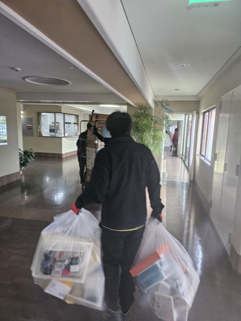 カゴ台車に乗らない物は手押しの台車などを用いて運び出させていきました。