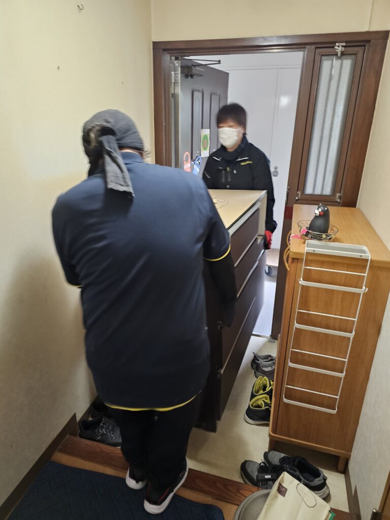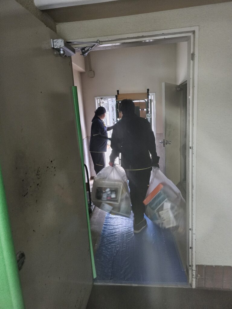他のご入居者の迷惑にならないように運び出し、万が一にも傷が付かないようドアに緩衝材や床にビニールシートを敷かせて頂いております。(写真2枚目)