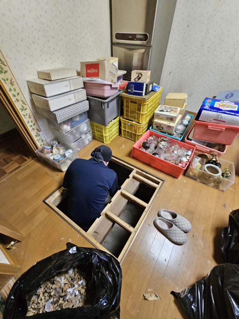 動画1つ目はキッチンの床下収納を整理中の風景です。広いスペースに所狭しと食器類などが入っておりました。
